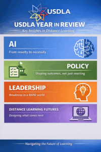 Over the past 12 months, the USDLA blog has served as a reflective space for the distance learning and broader educational communities to explore not only the rapid changes in technology but also the deeper questions facing education systems as they navigate those changes. USDLA’s blog has traced a clear evolution in how distance learning leaders, educators, and policymakers are thinking about technology, human learning, and institutional responsibility. What began as urgent conversations about artificial intelligence evolved into more nuanced considerations of leadership readiness, policy alignment, and long-term futures for distance and digital learning.